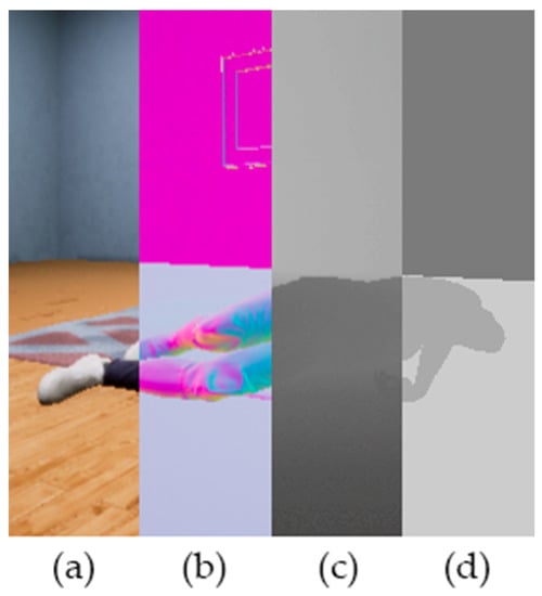 In [], the authors used human motion segmentation with background subtraction. The main measure was a significant change in visual information between subsequent image frames. However, differences in the background and the presence of occlusion objects, different camera viewpoints, and variability of the person’s appearance led to poor generalization of methods applied to the real world []. The authors of work [] made a great contribution to the study of 3D information about a person falling from several cameras and sensors, and the analysis was carried out using depth maps. As noted by the authors in the work [], systems with multiple cameras generated more accurate fall detection results. However, these methods have additional limitations, such as data synchronization and depth detection for 3D sensors, and it is not useful for cases in which cheapness, quick responses and simplified usage are required. Fall detection with a monocular camera has an advantage against other methods due to the absence of the above restrictions.