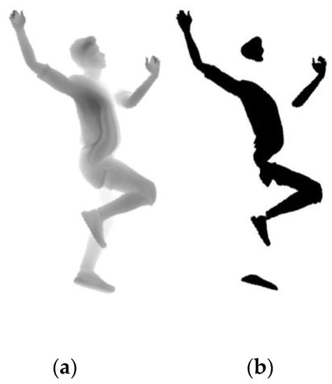 This is the main scene-capturing component, which is located in the plane of the floor and is directed perpendicular to the ceiling of the room. The component registers render target texture in a 2D frame by frame in an orthographic projection, and displays the scene depth buffer relative to the floor plane. Figure 6a shows the results of depth buffer rendering with a maximum scan value of 0.17 m. The resulting frame with the depth mask has the threshold value of 0.037 m and is normalized relative to the entire mask (Figure 6b). Thus, we obtain a “fingerprint” of the digital human body on the surface of a floor, which is further projected according to the view of the activated camera.