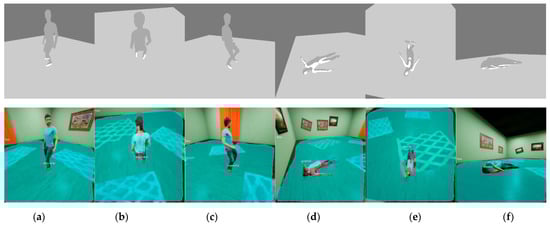 Figure 8 presents the simulation results of the digital human in two different rooms, where top—ground truth segmentation maps (hit map = 1.0; floor = 0.79; human = 0.66; walls = 0.48), and bottom—hit map predictions by model with rendered rgb images. In Figure 8a–c, the example images before falling from different cameras and labelled “did not fall” were shown, and Figure 8d–f, images are labelled “fall”. The recorded samples of fall scenarios represent different interactions with the environment during a fall, which can be divided into three main cases: the subject falls forward (Figure 8d), falls back (Figure 8e) and falls on the side (Figure 8f), the description of which will be detailed below.