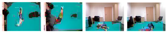 For the registration of an arbitrary moment without falling (walk or stand) and the moment of falling from the different views, 16 cameras were performed. The duration of each simulation was 1–3 s. Simulations were run on the PC with an 8th core and 16th threaded processor with 4.3 GHz and GeForce RTX 2080 video card. If a Person’s location took place in the proximity of the walls and corners of the room, then some amount of cameras were expected to be outside the room. Therefore, data from such cameras were automatically excluded from the sample. As a result of two experiments, 27,476 and 12,698 images of 512 × 512 size were modelled and collected accordingly.