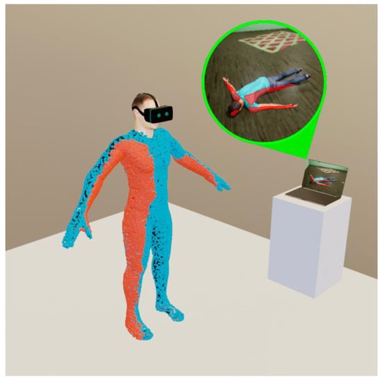 There can be many other possibilities of such synthetic data generation pipeline usage. The described approach of digital human synthetic data generation can be effectively used in many applications. In addition, based on the received positive results, we can shed light on developing possibilities for a type of VR controller that can produce a new level of virtual environment interaction and deepen user VR experiences. The concept of such a controller is shown in Figure 10. The main idea is to provide the VR operator with a matrix of several sensors (pictured as blue and red on the suit) which use mechanic or electrical signals. As demonstrated in Figure 10, it is the connection between the virtual reality results of a digital human body interaction with the environment and with sensors on a suit that is schematically lighted as red for the correspondent hit map and blue—sensors that are not activated.