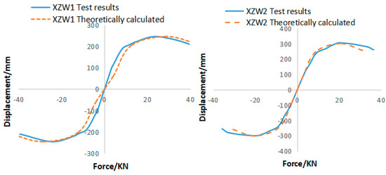 Based on the restoring force curves and hysteresis relationships obtained in Figure 13, the theoretical calculated hysteresis curves for wall specimens XZW 1 to 4 can be obtained by using the Dm and Pm values of each specimen from Table 4. The theoretical hysteresis curves of the restoring force model are compared with those from the test (Figure 14). From the comparison of each specimen, the four-line restoring force model proposed in this paper basically reflects the hysteresis characteristics of the specimens, as verified by the good fitting with the test results.