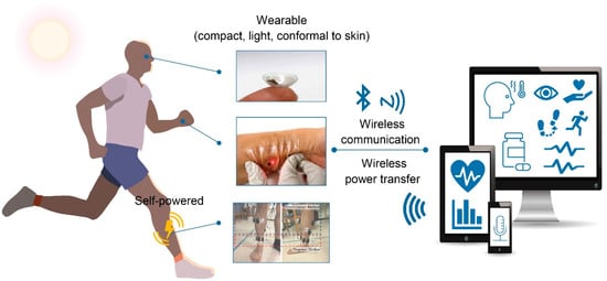 The source of power is one of the key factors for the long-term, stable operation of wearable sensors. Lithium-ion batteries are used most commonly in wearable electronics. However, their bulkiness and rigidity could limit the wearability of the whole integrated system despite other components being flexible and stretchable. To address this issue, various approaches have been used to implement structural modifications, such as the island-bridge, serpentine structures, and origami folding [,]. However, lithium-ion batteries still have toxicity issues, and they require intermittent recharging or replacement, which limits the sustainable use of the devices that use them. Therefore, there has been significant interests in developing self-powered systems and using them in wearable electronics. Wireless power transfer and energy harvesting technologies are the two main technologies that are being used in self-powered systems.