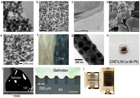 (a) Transmission electron microscopy (TEM) image of Ag NPs. Scale bar, 50 nm (reprinted with permission from []. Copyright 2018 Publish by MDPI); (b) Scanning electron microscopy (SEM) image of silver nanowires, Scale bar, 1 um (reprinted with permission from []. Copyright 2018 IEEE); (c) TEM image of graphene oxide (GO). Scale bar, 200 nm (reprinted with permission with []. Copyright 2019 American Chemical Society); (d) SEM image of Ag flakes anchored with Ag Nanoparticles/amine-functionalized multi-walled carbon nanotubes (NH2-MWCNT) hybrid material (reprinted with permission from []. Copyright 2017 nanoscale); (e) SEM image of the PPy nanowires. Scale bar, 200 nm (reprinted with permission from []. Copyright 2017 WILEY-VCH Verlag GmbH & Co. KGaA, Weinheim, Germany); (f) Optical image of the poly (3,4-ethylenedioxythiophene) polystyrene sulfonate (PEDOT:PSS) electrode on cotton textile. Scale bar, 250 um (reprinted with permission from []. Copyright 2019 IEEE); (g) TEM image of a poly (vinylidene fluoride-co-hexafluoropropene) (PVDF-HFP)/PEDOT nanofibers (NF). Scale bar, 200 nm (reprinted with permission from []. Copyright 2018 Springer Nature); (h) Optical image of LM/CNT composite using CNTs decorated with Pt nanoparticles. (reprinted with permission from []. Copyright 2019 American chemical society); (i) High conductivity and surface tension of Galinstan (left) and optical image of a device after Galinstan injection (right). Scale bar, 250 um (reprinted with permission from []. Copyright 2014 Springer Nature); (j) Stretchable and tough hydrogels. The stretched to 17 times its initial length (right) (reprinted with permission from []. Copyright 2012 Springer Nature).