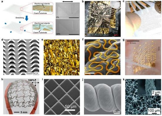(a) (Left) Schematic image of the hybrid substrate where the reinforced islands are embedded in the elastic substrate. (Right) SEM images before (top) and during (bottom) 30% stretching. The arrow indicates the direction of stretching direction. Scale bars, 500 μm SEM images before (top) and during (bottom) 30% stretching. The arrow indicates the direction of stretching direction. Scale bars, 500 μm. SEM images before (top) and during (bottom) 30% stretching. The arrow indicates the direction of stretching direction. Scale bars, 500 μm. (reprinted with permission from []. Copyright 2018 American Association for the Advancement of Science); (b) at only 2 μm thickness, devices are ultraflexible and can be crumpled like a sheet of paper. Scale bar, 1 cm (reprinted with permission from []. Copyright 2013 Nature Publishing Group); (c) A 4 × 4 stretchable organic electrochemical transistors (OECT) array when intrinsically stretched. Scale bar, 3 mm (reprinted with permission from []. Copyright 2018 American Association for the Advancement of Science); (d) Si ribbon structures formed on a PDMS substrate pre-strained to 50% and patterned with Wact = 15 µm and Win = 250, 300, and 350 µm (from left to right). The image was taken by tilting the sample at an angle of 45° (reprinted with permission from []. Copyright 2006 Nature Publishing Group); (e) Corresponding optical micrographs of the wrinkled Au film electrode at 0%. Scale bar, 100 μm (reprinted with permission from []. Copyright 2018 American Chemical Society); (f) scanning electron microscopy images of third-order Peano-based wires on skin and a skin-replica (colorized metal wires), showing the conformal contact of the wires on the substrate. Scale bar in (f), 500 μm (reprinted with permission from []. Copyright 2014 Nature Publishing Group); (g) Image of a 4 × 4 TCR sensor array after application to the skin using a water-soluble adhesive tape based on poly(vinyl alcohol) (reprinted with permission from []. Copyright 2013 Nature Publishing Group); (h) Optical image of a final mesh heater after biaxial stretching up to ~100% (reprinted with permission from []. Copyright 2015 American Chemical Society); (i) SEM images of Ag mesh, demonstrating a space length among Ag lines of 45 µm (reprinted with permission from []. Copyright 2018 WILEY-VCH Verlag GmbH & Co. KGaA, Weinheim, Germany). (j) High-magnification SEM image of the CNT loops (reprinted with permission from []. Copyright 2012 WILEY-VCH Verlag GmbH & Co. KGaA, Weinheim, Germany) (k) SEM images of PUS-AgNW-PDMS composites (reprinted with permission from []. Copyright 2013 WILEY-VCH Verlag GmbH & Co. KGaA, Weinheim, Germany).