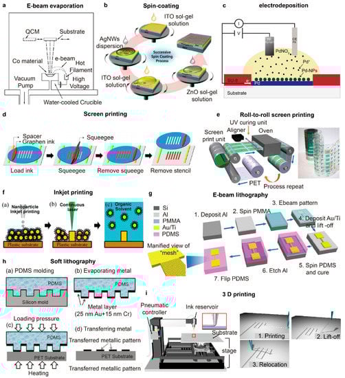 (a) Schematic Illustration of an e-beam evaporation system (reprinted with permission from []. Copyright 2004 American Vacuum Society); (b) Schematic illustrations of the successive spin coating ofITO, AgNWs, and ZnO dispersions (reprinted with permission from []. Copyright 2015 Royal Society of Chemistry); (c) Schematic illustration showing the electrodeposition of palladium nanoparticles (PdNPs) (reprinted with permission from []. Copyright 2019 John Wiley and Sons); (d) Schematic illustrations showing the process of screen printing using a silicon stencil and a pristine graphene ink (reprinted with permission from []. Copyright 2015 John Wiley and Sons); (e) (Left) Schematic illustrations of roll-to-roll rotary screen printing of electrodes for sweat sensing patches and (right) an optical image of the as-fabricated sensing electrode patterns (reprinted with permission from []. Copyright 2019 The American Association for the Advancement of Science); (f) Schematic illustrations of inkjet printing and patterning of AgNPs using laser sintering (reprinted with permission from []. Copyright 2017 John Wiley and Sons); (g) Schematic illustrations demonstrating the fabrication process of high-resolution gold patterns onto elastomer using spin-coating, e-beam lithography and etching (reprinted with permission from []. Copyright 2018 Springer Nature); (h) Schematic illustrations of soft lithography involving PMDS molding, metal deposition and metal pattern transfer (reprinted with permission from []. Copyright 2017 MDPI); (i) (Left) Schematic illustrations of the 3D direct printing system and (right) printing, lift-up and relocation steps (reprinted with permission from []. Copyright 2019 The American Association for the Advancement of Science).
