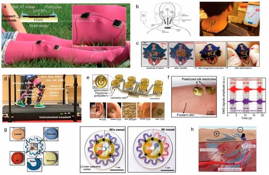 (a) A photograph of stretchable carbon nanotube strain sensor attached to clothing to detect physical motion (reprinted with permission from []. Copyright 2011 Springer Nature); (b) Ionic liquid-based sensor patch of cervical movement detection for directional strain calculation of skin during neck movement (reprinted with permission from []. Copyright 2014 Royal Society of Chemistry); (c) Commercial epidermal tattoo with the integrated circuit at its backside for multifunctional application (reprinted with permission from []. Copyright 2011 American Association for the Advancement of Science); (d) Photo of the patient using exoskeleton assisted knee extension on an instrumented treadmill (reprinted with permission from []. Copyright 2017 Spring Nature); (e) (Top) EEG electrode with a tripolar concentric ring with an integrated capacitive design. (Bottom) Images of ring electrodes on the skin for EEG measurement (reprinted with permission from []. Copyright 2015 National Academy of Sciences); (f) (Left) A photograph of plasticized silk electrode on human forearm for EMG measurement. (Right) EMG signals obtained by silk electrode during muscle movement with comparison to commercial gem electrodes (reprinted with permission from []. Copyright 2018 John Wiley and Sons); (g) (Left) Colorimetric detection reservoirs for water lactate, glucose, creatinine, pH, and chloride ions in a wearable microfluidic device. (Right) Images of epidermal microfluidic electrochemical sensor after injection of artificial sweat (reprinted with permission from []. Copyright 2016 The American Association for the Advancement of Science); (h) Glucose detecting mechanism schematics of a skin-like sensor using an electrochemical twin channel (reprinted with permission from []. Copyright 2017 The American Association for the Advancement of Science).