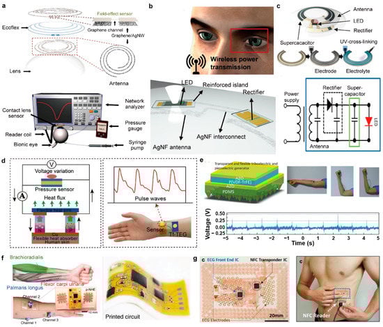 (a) Wireless power and data transfer between a smart contact lens and a network analyzer via inductive coupling (reprinted with permission from []. Copyright 2017 Springer Nature); (b) Smart contact lens with a wireless power transfer circuit and a LED display (reprinted with permission from []. Copyright 2018 American Association for the Advanced Science); (c) Smart contact lens integrated with a wireless power transfer circuit, LED pixel, and printed solid-state supercapacitors for continuous operation (reprinted with permission from []. Copyright 2019 American Association for the Advanced Science); (d) Self-powered wearable patch for continuous monitoring of pressure driven by a flexible thin-film thermoelectric generator (reprinted with permission from []. Copyright 2020 Elsevier B.V); (e) Triboelectric and piezoelectric generator with body movement sensing (reprinted with permission from []. Copyright 2017 Royal Society of Chemistry); (f) Wireless bioelectronics for multimodal human-machine interfaces via BLE (reprinted with permission from []. Copyright 2020 Springer Nature); (g) E-tattoos for wireless, personalized multimodal sensing via NFC (reprinted with permission from []. Copyright 2019 John Wiley and Sons).