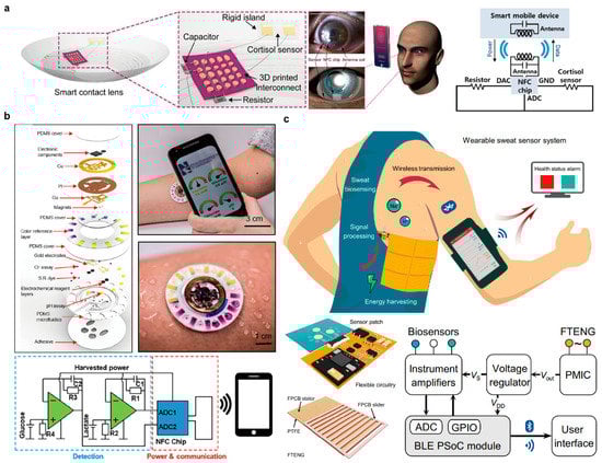 (a) Smart contact lens for wireless cortisol monitoring integrated with a cortisol sensor, antennas, and wireless communication circuits operated via NFC (reprinted with permission from []. Copyright 2020 American Association for the Advancement of Science); (b) Wireless skin-interfaced sensor integrated with a microfluidic module, colorimetry sensor, biofuel cell-based electrochemical sensor, battery-free NFC electronics (reprinted with permission from []. Copyright 2019 American Association for the Advancement of Science); (c) Wireless wearable sweat sensor powered by human motion, equipped with a freestanding triboelectric nanogenerator (reprinted with permission from []. Copyright 2020 American Association for the Advancement of Science).