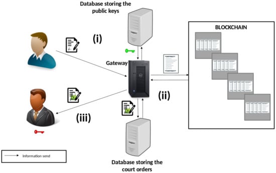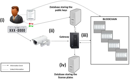 - The user requires the license plate for his/her vehicle and configures the privacy preferences for monitoring. This information is registered in a smart contract stored in the private blockchain. At this point, the public and private keys of the user are also generated. When the user requires the license plate, the registration is done by a system connected directly to the blockchain, without going through the gateway. Moreover, only the authorized addresses can change the privacy preferences of a smart contract after it is registered.