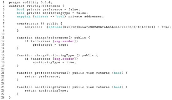 As we can see in the algorithm shown in Figure 3, the system performs an address mapping that can change the privacy preferences of a contract. If the gateway verifies that the contract does not include the requestor address, it cannot be changed. We consider that one or more government agencies can request monitoring, and therefore each agency must have a registered address.