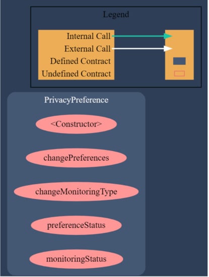 We used the Surya tool to generate a graphic representation of the contract developed and illustrate its complexity. Surya is a utility tool for smart contract systems that provides a number of visual outputs and information about the structure of the contracts. It also supports querying the function call graph for manual inspection of contracts. As shown in Figure 7, the contract functions do not interact with each other and cannot be called externally by other smart contracts. This approach reduces the complexity of contracts and avoids security issues.