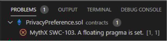 The report produced by the Mythril tool displays the security warning MythX SWC-103. A floating pragma is set, which is issued when we denote in the contract a different version of the pragma used in the compiler. The developed contract was built using version 0.6.4 (line 1 of Figure 3), while the Solidity compiler installed on the computer applied in the tests used version 0.6.7. This type of approach can be harmful as outdated versions of the pragma can generate bugs in the execution of the contract. To solve this problem, we need to change the contract to use the same version of the compiler installed on the machine.