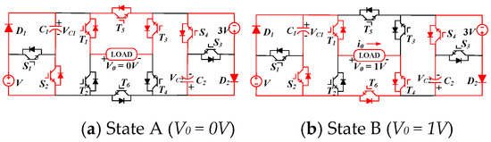 The proposed topology can be utilized in asymmetric and symmetric configurations. Table 2 illustrates the switching states of T1 to T6 and S1 to S4, the charging and discharging states of capacitors C1 and C2 in a fastidious switching state. “C” and “D” indicate that the capacitor is charged and discharged, respectively. “-” indicates that there is no change in the states of the capacitors. “1” denotes the on state of switches, while “0” denotes the off state of switches.
