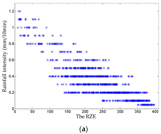 After removing the co-channel interference from these radar images, the time resolution is set to 10 min by the moving average method during the experiment. It is assumed that the spatial distribution of rainfall is uniform in a short period of time. The average value of RZE parameters of 32 radar images in a group of radar image sequence is taken as the RZE parameter of this sequence during this period, and the rainfall of this sequence is the accumulated value of rainfall during this period.