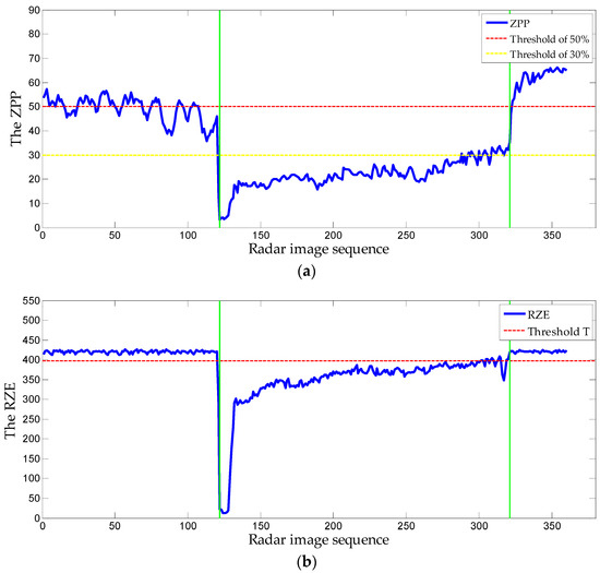 The rainfall detection results of the X-band marine radar images are shown in Figure 13. Figure 13a shows the performance of the traditional ZPP method for rainfall detection. The blue solid line denotes the curve trend of the calculated ZPP, and the selected area with green solid line denotes the radar image in the presence of rainfall. The red dotted line denotes the determined detection threshold proposed by Lund et al. Figure 13b shows the performance of the RZE method for rainfall detection. The blue solid line denotes the curve trend of the calculated RZE, and the selected area with green solid line denotes the radar image in the presence of rainfall. The red dotted line denotes the detection threshold of the RZE method, which is determined in Section 4.1.