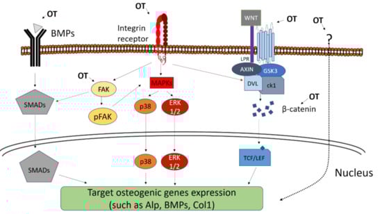 Schematic figure of the topography-induced osteogenesis. Some pathways and proteins are shown to be related to this activation, including MAPK pathway, Focal Adhesion Kinase (FAK) activation, BMPs and the Wnt/b-catenin pathway. An osteogenic topography (OT) can activate these pathways in several ways, such as: (1) in the MAPK pathway, activation occurs from the connection to integrins, leading to activation and translocation to the nucleus of p38 and ERK ½; (2) BMPs, when connecting to a BMP receptor, trigger the activation and translocation of SMADs; (3) and the Wnt protein complex coupled to its specific receptor trigger the accumulation of beta-catenin and its translocation to the nucleus. Other forms of topography-induced osteogenic phenotype are not yet fully elucidated (dotted arrow), but it is known that the activation of the FAK and beta-catenin pathways may be involved and be activated through other pathways not yet known.