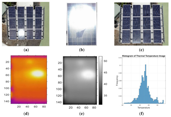 Figure 13a shows the original IR image of the first panel with a clear and bright area in the top middle that corresponds to a defected cell while the upper middle is the junction box as mentioned before. The dark purple lines around the cells are frames of the panel. Figure 13b shows an image converted to grayscale after Gaussian filtering but the bright region still appears clearly. Figure 13c shows a 3-D color image after Gaussian filtering to tell the temperature difference that the hot spot in the top middle is at about 53 °C. Panel frames are at the temperature of 43 °C while the rest of the panel is at around 45~49 °C. Figure 13d shows a histogram of the temperature distribution. The PDF curve still looks like a beta distribution function. The mean temperature is 42 °C with the deviation of −11 °C. The maximum temperature is 53 °C and the minimum temperature is 30 °C. Figure 13e displays the cumulative temperature distribution that the percentage of hot spot area over 50 °C is 1.6%, indicating there is only one cell exceeding the temperature threshold. Finally, Figure 5e and Figure 13e are superimposed in Figure 13f for comparing normal and abnormal conditions. It is found that the area over 50 °C is about 1.6%, which is close to the 1.5% threshold presumed for a normal solar module, indicating that there is no abnormality or failure. The above description shows that 98.5% of the panel is within the normal area, as shown in Figure 13d,e. This is consistent with Figure 13a–c, which shows that bright area of hot spot is clearly visible.