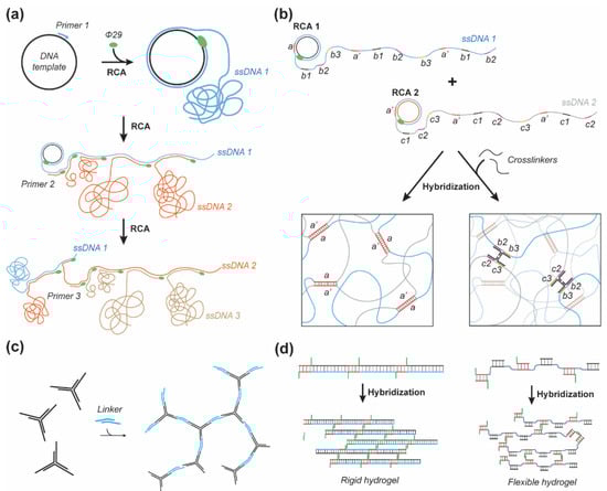 Structural DNA hydrogel design. (a) Hydrogel formation by entanglement of RCA-produced concatemeric DNA strands. (b) Hydrogel formed by crosslinking of two RCA-produced ssDNA. (c) Hydrogels formed by hybridization of multivalent DNA nanostars. (d) Hydrogels formed by hybridization of linear sections of dsDNA.