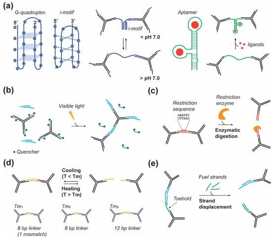 Responsive DNA linkers. (a) G-quadruplex motif, i-motif, and aptamers used to control mechanical properties of DNA hydrogels. (b) Photoresponsive assembly of DNA hydrogels. (c) Enzymatic digestion of DNA hydrogels. (d) Thermoresponsive DNA hydrogels. (e) Strand displacement method used to control DNA hydrogel assembly.