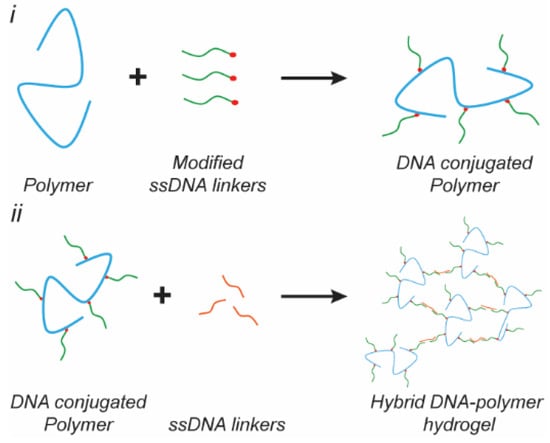 Hybrid DNA–polymer hydrogel formation. (i) Polymer chain conjugation with modified ssDNA linkers to form ssDNA conjugated polymer. (ii) ssDNA conjugated polymers crosslinked by complementary ssDNA linkers to form hybrid DNA–polymer hydrogel.