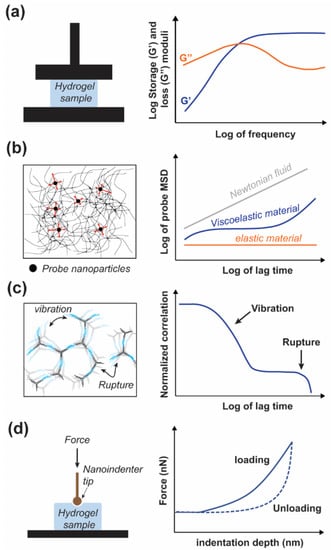There are a variety of methods to characterize the mechanical properties of hydrogels; generally categorized as compression, indentation, and rheology. Conventional rheological measurements are conducted via bulk rheology (Figure 4a), which includes parallel plate [,,] and parallel cone and plate [].