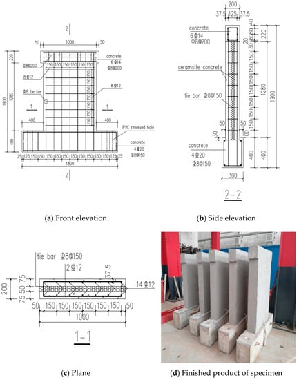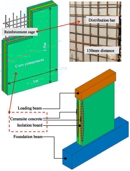 In the research on ceramsite concrete sandwich wall panels, most of the panels are used as infill partition walls, and the use of ceramsite concrete as a load-bearing structural layer for load-bearing wallboards in seismic structures has not been discussed in depth [,,,,,]. In this case, this study had the aim of proposing double-row reinforced ceramsite concrete with a core composite wall panel. The 50-mm thick polystyrene insulation board was located in the middle layer with fireproof grade B1. The inner and outer sides of the ceramsite concrete slabs were jointly load-bearing. Compared with the ceramsite concrete sandwich wall slabs as infill partition walls, the reinforcing steel meshes were used inside the slabs instead of ordinary steel wire mesh as the distribution reinforcement. The inner and outer side slabs were connected to the middle insulation layer through the tie reinforcement on both sides. The combination became a new composite wall slab with structural integration for the insulation system. The joint was a new composite wall panel with structural integration, which bore common forces. The use of the connection method for straight inserted reinforcement was considered to assemble the wall panel, as shown in Figure 1c. This type of connection method ensured the integrity of the internal insulation board. While the overall stiffness of the wall panel was improved, the method did not affect the thermal performance. Finally, an attempt was made to improve the crack resistance and the ductility of the ceramsite concrete by attaching alkali-resistant glass fibers to the ceramsite concrete to further improve the seismic performance of the wall panels.