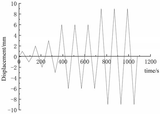 With reference to the “Regulations on Seismic Test Methods for Buildings (JGJ/T 101-2015)” [], the vertical loading device was first loaded to 40–60% of the design value, and then gradually loaded to 100%. The vertical loading value was kept constant during a cyclic loading test. The horizontal loading was controlled by displacement, and cyclic loading was performed according to the loading curve. The loading curve is given in Figure 3. In summary, before the specimen yielded, each level was loaded once, and after the specimen yielded, each level was cyclically loaded three times. When the specimen load dropped below 85% of the peak load, the test was completed []. The test setup is shown in Figure 4.