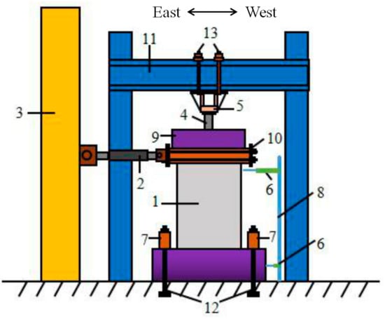 Loading device. Notes: 1. Wall panel specimens; 2. Actuator; 3. Reaction wall; 4. Hydraulic jack; 5. Sensor; 6. Displacement gauge; 7. Reaction beam; 8. Upright stanchion; 9. Rigid strut beam; 10. The pull rod connection device; 11. Positive electrode method; 12. Anchor bolt; 13. Set bolt.