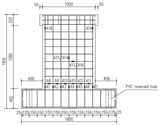 The strain gauge numbers were A1–A19, and these strain gauges were used to monitor the yield of the edge reinforcement. The specific location is shown in Figure 5. The strain gauge numbers for the concrete were H1–H11, and a vertical strain gauge was pasted at the center of the lower edge of the north wall plate. The conductor of the southern steel bar strain gauge was connected to the strain gauge outward through the lower central position, so this strain gauge was pasted on the northern wall plate.