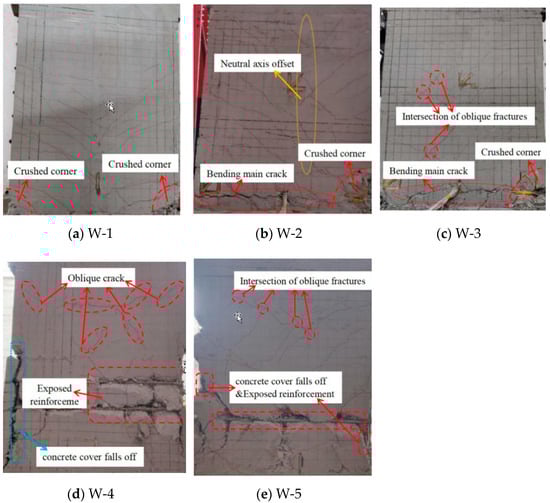 After the surface stripped concrete was treated, the damage characteristics of the five specimens were noted. The failure characteristic diagram of the specimens are shown in Figure 7. The following patterns could be found: (1) At the time of damage, due to the different ranges of the plastic hinge, the corners of the specimens all showed different degrees of crushing and spalling. (2) The W-1, W-2, and W-3 specimens were mainly damaged by bending. The W-4 specimen was mainly damaged by shearing. This difference indicated that for the same size and reinforcement, the choice of ceramic concrete as the load-bearing layer material for the sandwich wall panels is more in line with the seismic design requirements. (3) Compared with the damage to the W-4 specimens, the cracks formed during the damage to the W-1 specimens were denser. Additionally, the crack distribution during the damage to the W-2 specimens with additional fiber was more obvious. This indicated that the wall slab had a better ability to absorb and dissipate the seismic energy when ceramic concrete was used as the structural layer material. (4) The W-5 specimens had the phenomenon of concrete protective layer spalling at the lower abdomen position. The shear damage was more severe. In addition, a comparison of the cracking of the specimen W-5 with the remaining four sandwich wall panels revealed that the sandwich wall panels cracked earlier. Furthermore, additional fibers could improve the premature cracking of the ceramic concrete sandwich wall panels. By comparing the test results of specimen W-1 with W-2 and W-3, it could be seen that the additional fiber volume admixtures of 0.3% and 0.4% could increase the cracking displacement by 42.1% and 36.8%, respectively.