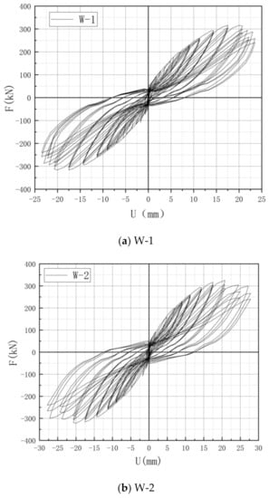Finally, the hysteresis curves of W-1 were compared with those of W-2 and W-3. W-2 showed a significant recovery deformation hysteresis. The result indicated that the addition of fibers could alleviate the problem of poor integrity caused by the sandwich core. Additionally, it was conducive to the establishment of force transfer paths and the energy dissipation capacity of the wall panel. In contrast, although the hysteresis curve of W-3 showed a more obvious inflection point, its hysteresis loop area was reduced, and the overall trend was more biased toward the displacement axis with a larger slip. This phenomenon indicated that fiber agglomeration was easily caused when the fiber doping was higher. This, in turn, caused a decrease in the load-bearing capacity.