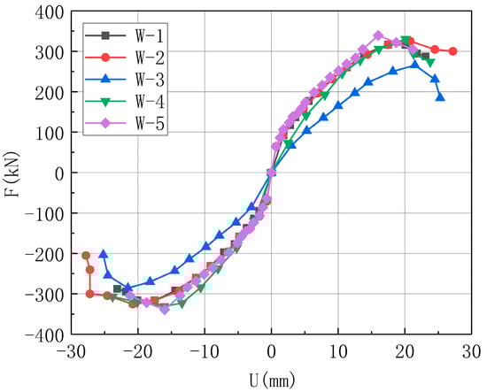 By observing the hysteresis curves of the five specimens in Figure 8, it can be seen that all five specimens were pinched together in an inverse S-shape. In the elastic stage, the hysteresis curves of the specimens plus and minus the hysteresis curves basically overlapped. The hysteresis ring enclosed a small increase in area from the specimen cracking to the gradual yielding stage. The residual deformation was small. With the increasing loading displacement and the damage accumulation, the area of the hysteresis loop gradually increased. The energy dissipation of the specimen increased accordingly.