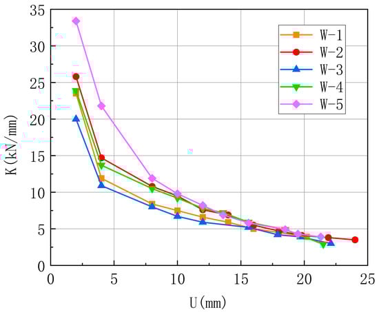 The stiffness degradation of the specimens was evaluated using the cut-line stiffness []. Figure 11 shows a comparison of the stiffness degradation of the five specimens. Firstly, the initial stiffness of W-5 was the largest. Secondly, the degradation curves of the four sandwich wall panels had no obvious inflection point before and after yielding. Finally, the initial stiffness of the W-2 specimen increased compared to W-1, and after cracking, the rate of stiffness degradation became slower. In contrast, specimen W-3 not only resulted in lower initial stiffness than that of specimen W-1 due to excessive fiber incorporation, but also the degradation of wall panel stiffness was more obvious.
