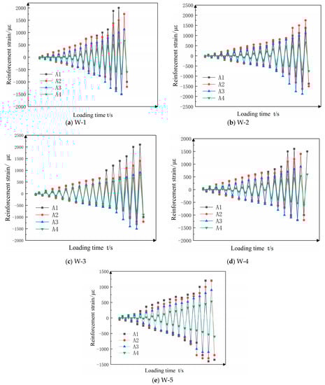 By processing the strains of the reinforcement bars numbered A1 to A4, the specific strain changes of the vertical distribution bars of the wall slab could be observed, as shown in Figure 12 below.