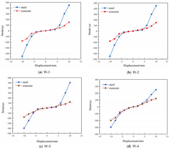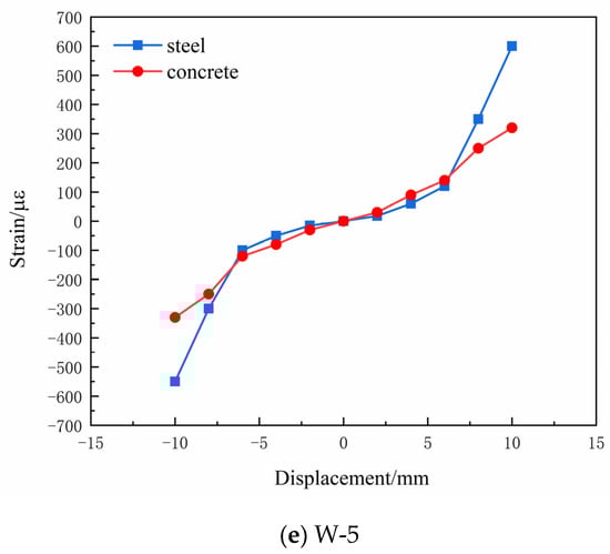 The valid data before the failure of the concrete strain gauges were selected and the strain curves of the reinforcement-concrete were plotted, as shown below, by specifically observing the synergy of each specimen. Firstly, when comparing Figure 13a with Figure 13e, it was obvious that the fitted length of the two materials was significantly shortened after adding the insulation board, which more intuitively indicated that the sandwich wall panels were less able to work together. Secondly, Figure 13a–c shows that the integrity of the W-2 specimen was significantly improved, while the change of W-3 was not significant, indicating that the fiber doping of 0.3% was more beneficial for improving the integrity of the specimens than the fiber doping of 0.4%. Finally, the difference between the fitted lengths of W-4 and W-1 was not significant, which indicated that the two load-bearing materials selected in this research had less influence on the integrity of the test wall panels.