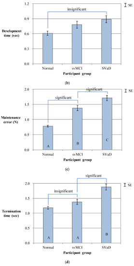One-factor between-subjects ANOVA and Tukey tests were conducted using MINITAB (Minitab Inc., State College, PA, USA) at α = 0.05. This study excluded data that fell outside 95% confidence intervals of repeated trials [10,11]. The average proportion of excluded data was similar among the three groups of participants (normal: 4.0%, svMCI: 3.5%, and SVaD: 3.3%).