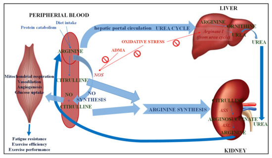 It also inhibits platelet aggregation and prevents the adhesion of leukocytes throughout the endothelial cell layer of blood vessels, inhibiting the proliferation of vascular smooth muscle cells by the inhibition of cytochrome oxidase, regulating the consumption of mitochondrial oxygen [,]. Abnormal vascular NO production and transport cause endothelial dysfunction with several cardiovascular pathologies such as hypertension, atherosclerosis and angiogenesis-associated disorders []. NO synthesis depends on Arg availability, which can be affected by: intracellular synthesis of Arg from CIT (which in turn depends on CIT being available), transport of extracellular Arg (cationic amino acid) and arginase activity (which competes with NOS for Arg). Additionally, asymmetric dimethylarginine (ADMA) is an endogenous inhibitor for all three NOS isoforms and has been reported as a risk factor for all causes of cardiovascular mortality [].
