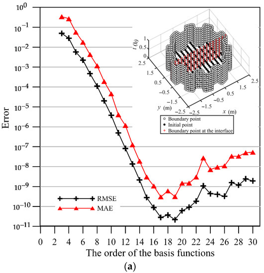 Figure 3a shows the error versus the order of the basis functions. It appears that approximations with a high accuracy are acquired then the order is superior to 14. Additionally, promising results may be obtained when the order of the basis function ranges from 14 to 26. It seems that the optimal order may depend on the nature of the problems. The relationship between the absoluter error and the number of boundary points is displayed in Figure 3b. The results obtained illustrate that approximations with a high accuracy are achieved when the number of boundary points is greater than 1800. From the results of this convergence analysis, the number of the boundary points and the order of the basis functions were determined to be 2000 and 15, respectively.