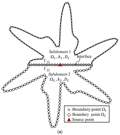 where is the hydraulic diffusivity of the ith subdomain. The hydraulic diffusivity and hydraulic conductivity in two subdomains were set to be and , and and . The final elapsed time is 1 h. The boundary points are collocated on the boundary, as illustrated in Figure 1b. For simulating transient flows in two-layered porous media, DDM is utilized [35]. The domain boundary can be divided into several subdomains.