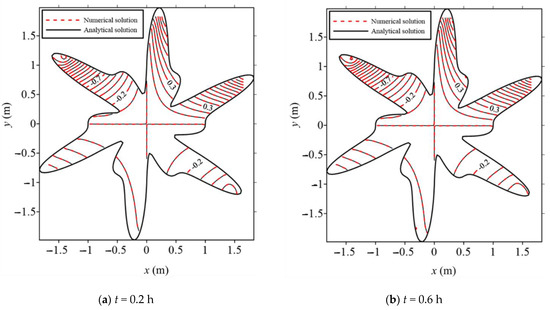 To compare the accuracy of our method with the analytical solution, the profiles of the results at different times are selected, as presented in Figure 5. Figure 5 shows that the computed results adopting our approach are completely consistent with the analytical solution.