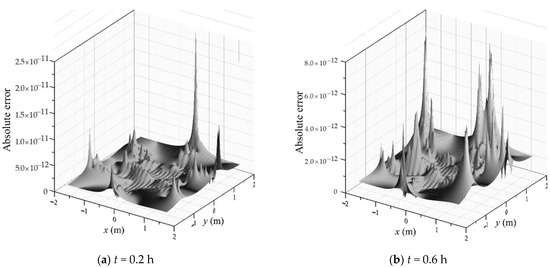 To examine the accuracy of our method, the absolute error of the approximate solutions with the exact solution is evaluated. Figure 6 displays the absolute error at different simulation times. From Figure 6, the MAE is in the order of 10−10, which indicates that our approach may acquire results with a high accuracy.