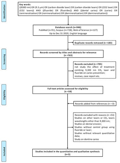 A literature search in English was performed by two independent investigators (Xue and Yin) to identify potentially relevant studies related to the research question across three electronic databases: MEDLINE via PubMed, the Web of Science core collection, and Scopus. There were no restrictions on the date of publication. The following key words were used to develop a list of potentially eligible studies based on a combination of specific medical subject headings (MeSH) and free text terms for these three databases: ((9300 nm) OR (9.3 µm) OR (carbon dioxide laser) OR (carbon dioxide lasers) OR (CO2 laser) OR (CO2 lasers)) AND ((fluoride) OR (fluorides)) AND ((dental caries) OR (caries) OR (remineralization) OR (remineralization) OR (demineralization) OR (demineralization)). The last search was performed on 31st January 2021 and studies published up to 31st December 2020 were included.