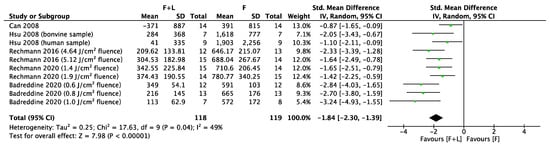 The results of the meta-analysis were separately assessed for comparing combined treatment (F + L) with single fluoride (F) and single laser (L) treatment. Each comparison was conducted on five studies which resulted in 10 comparisons, as some studies presented more than one experimental group. Figure 2 summarizes the findings of the meta-analysis comparing the effect of treatment combining fluoride and laser (F + L) and treatment using only fluoride (F) on mineral loss. As shown in Figure 2, the overall standardized mean difference in the meta-analysis was −1.84 (95% CI: −2.30 to −1.39). This indicates that the mineral loss of combined treatment was significantly less than that of the single fluoride treatment (p < 0.00001). The heterogeneity was found to be moderate (I2 = 49%).
