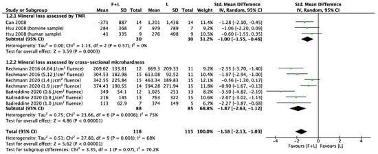 A high heterogeneity was found in the meta-analysis comparing the effects on mineral loss of the treatment combining fluoride and laser (F + L) versus treatment only with laser (L). We performed a subgroup analysis to look for the source of the heterogeneity. To our knowledge, this grouping method is the best not only because it was determined according to the types of fluoride or methods of assessing mineral loss, but as it can also be regarded as classified according to research group. High heterogeneity was found in the subgroup assessed by cross-sectional microhardness. The high heterogeneity could be due to the sample size and variation in the laser parameters used in the study design.