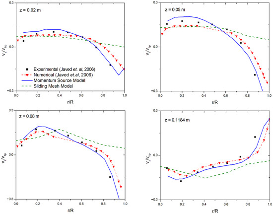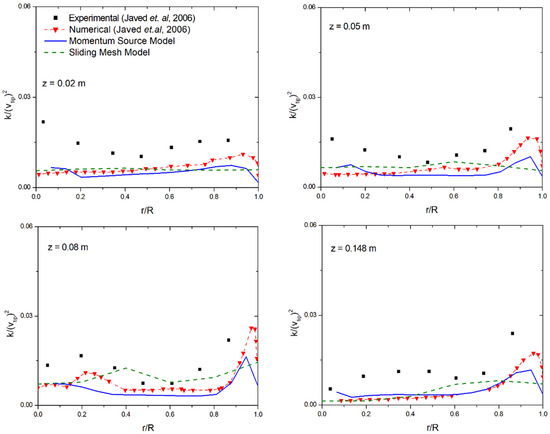 In Figure 11, Figure 12, Figure 13 and Figure 14, the time-averaged profiles for radial, tangential and axial velocities, and turbulence kinetic energy, respectively, are shown as a function of the radial coordinate for different heights of the tank. In general, the results obtained with the developed models presented similar behavior with the experimental and numerical results predicted by Javed et al. [11].