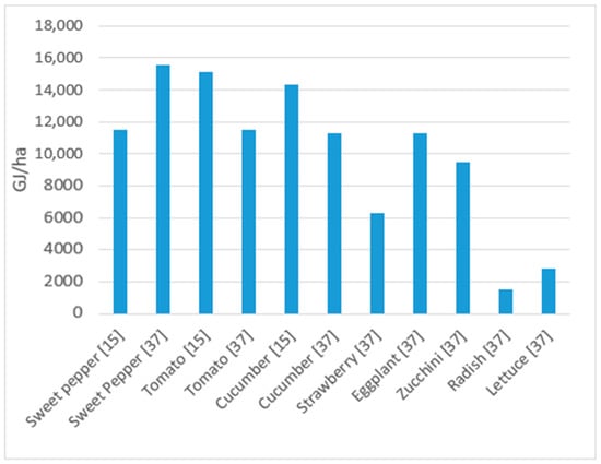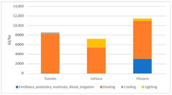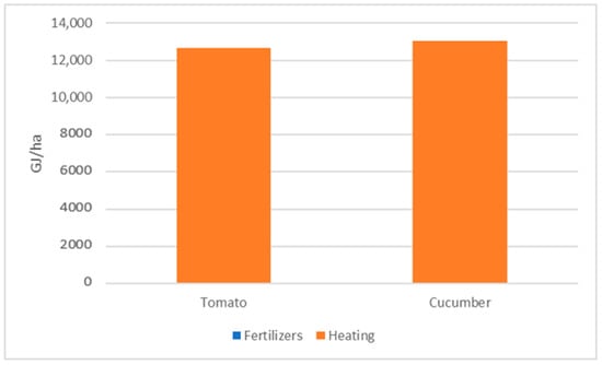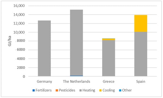 On a per crop basis, for the studies that have detailed data, the vast majority of the total energy inputs are connected with heating, accounting for over 99% of energy use, while other inputs, such as fertilizers, are minor (Figure 6 and Table A6). It is important to note that these energy requirements are amongst the highest recorded for all greenhouses in the EU-27. The most important activities for greenhouses in the Netherlands are heating, ventilation and air circulation, cooling, humidification, irrigation, pesticides, CO2 enrichment, and others [,].