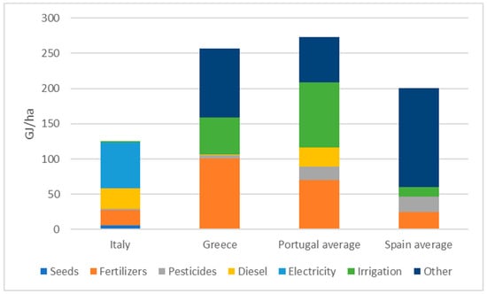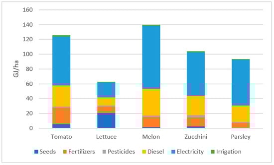 Data for Italy were only located for crops cultivated in low energy intensity greenhouses in central Italy (Figure 5 and Table A5). Within these data, energy use ranges between 60 GJ/ha to 140 GJ/ha and suggest that electricity accounts for around half of all energy inputs, followed by diesel at around a quarter of all energy inputs [].