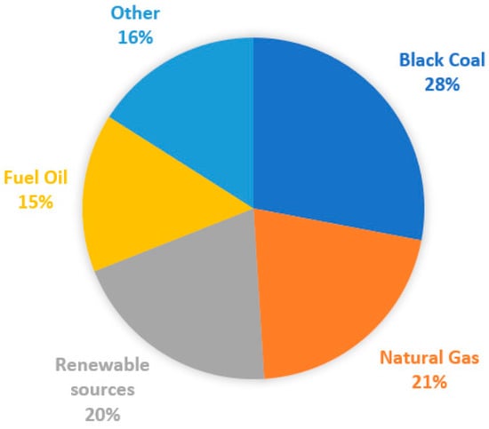 For Germany, Visser et al. (2012) investigates the energy consumption in greenhouses for tomato and cucumber production. The biggest share of the energy inputs is attributed to heating purposes, whereas a small portion of the energy inputs account for fertilizers (Figure 7). The available data suggest that close to 13,000 GJ/ha are consumed in the greenhouse cultivation of both crops, of which 99.6% accounts for heating purposes. According to Kuntosch et al. (2020), black coal is the largest source of energy for heating purposes followed by natural gas and renewables (Figure 8 and Table A7) [].