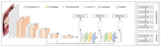 On the other hand, one-stage detectors obtain high inference speeds. They include the algorithms of the YOLO family, SSD family, and RetinaNet family. The first YOLO version was introduced by Joseph Redmon et al. in 2015 [], and an updated version of YOLOv3 was presented in 2018 []. In principle, YOLOv3 uses only one single neural network trained by an end-to-end model. The model takes an image as input data, predicts bounding boxes containing objects, and labels each bounding box. Like the previous YOLO versions, YOLOv3 uses the “dimensional clustering proposal” algorithm to identify bounding boxes. The YOLOv3 network architecture is shown in Figure 4, which was presented in the study of MAO et al. [].
